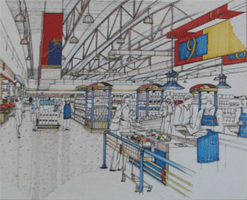 中心区打掉原有吊顶,新吊入整体框架深红色木网格,以框架为基准连接照明灯具及广告牌匾,下部货架颜色应与上部木网格的颜色相协调 |